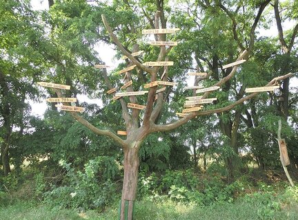 Der Schilderbaum am Elberadweg wurde 2009 aufgestellt. Eine alte Eiche aus dem Stadtwald fand hier ihre sinnvolle Verwendung. An ihm sind 30 Schilder angebracht, auf diesen erkennt man die Entfernung und Richtung zu vielen verschiedenen Zielen, z.B. Paris, London, Nordpol, Madrid, New York, Tokio.