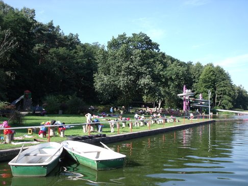 Wald- und Naturbad Dommitzsch: Idyllischer Badesee am Rand der Dübener Heide, umgeben von Natur mit Sanitäranlagen.